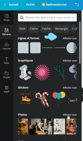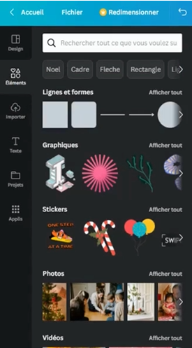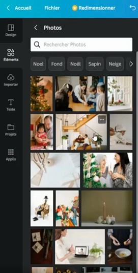 Les images libres de droit sont quasiment partout sur l’application. Vous pouvez les retrouver dans les « Éléments ».